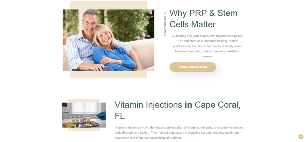 - Location-Specific Service Pages: Developed dedicated, geo-targeted landing pages for each core service vitamin injections, diet guidance, sexual health, and wellness programs each optimized for Cape Coral and surrounding SW Florida communities to capture high-intent local search traffic.
